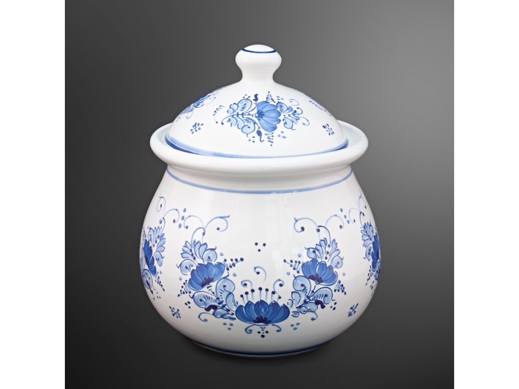 Objemná cukřenka. Bílá glazura a modrá dekorace.