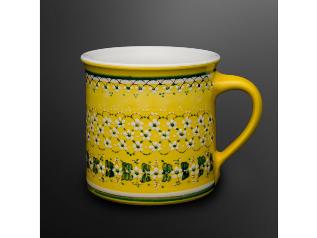 Large ceramic mug. Hand thrown on a pottery wheel. Yellow glazed and hand painted with green and white decor.