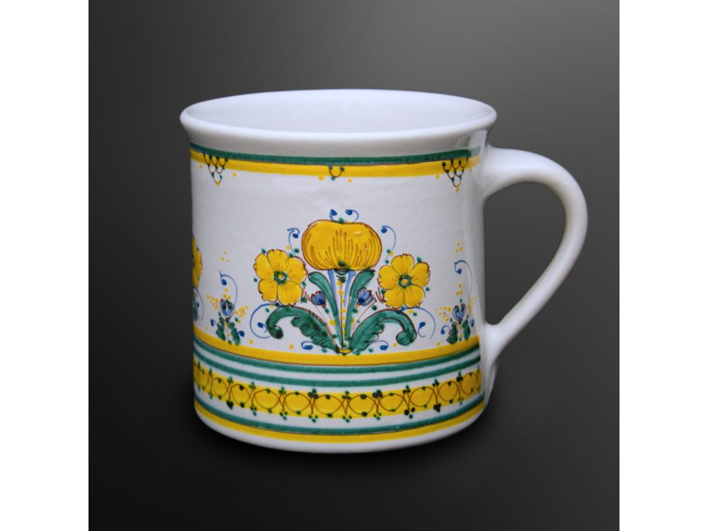 Large ceramic mug. Hand thrown on a pottery wheel. White glazed and hand painted with green and yellow decor.