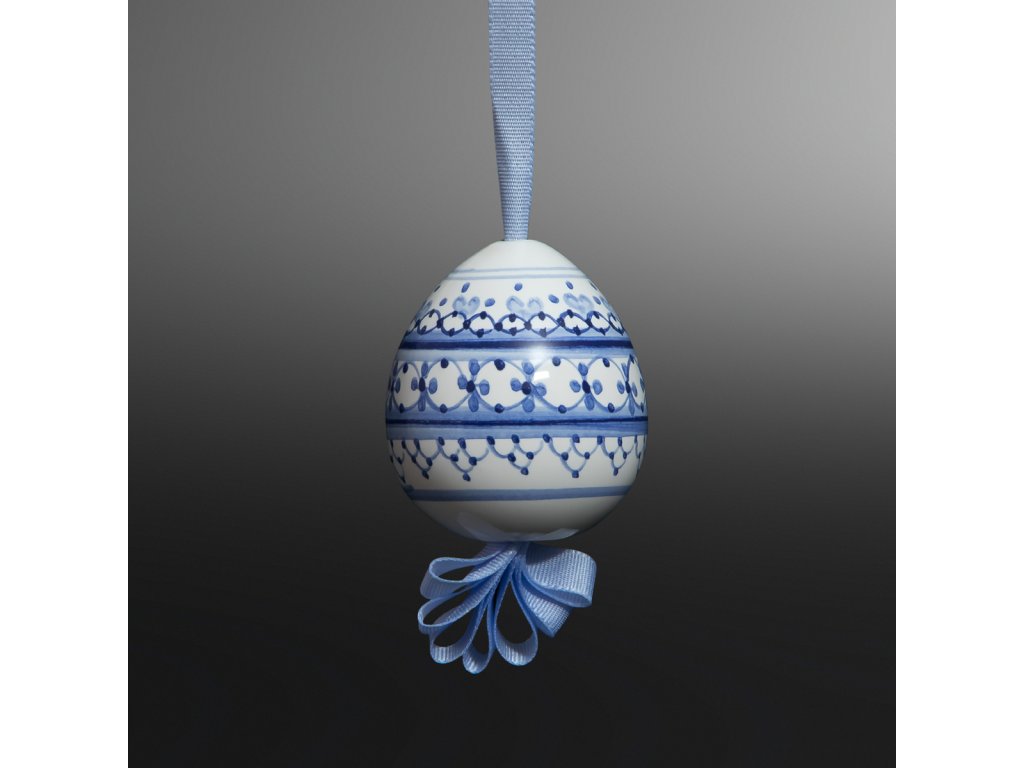 Decorative ceramic egg on a ribbon.