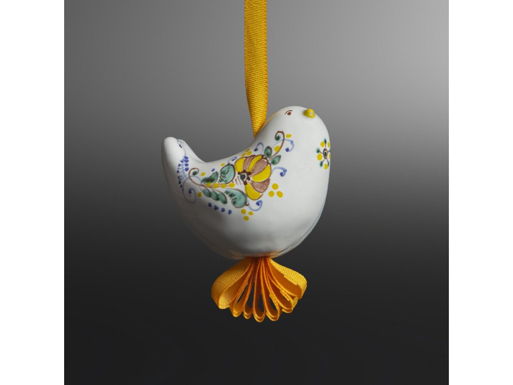 Malý keramický ptáček zavěšený na pentli. Bílá glazura a zelenožlutá dekorace.