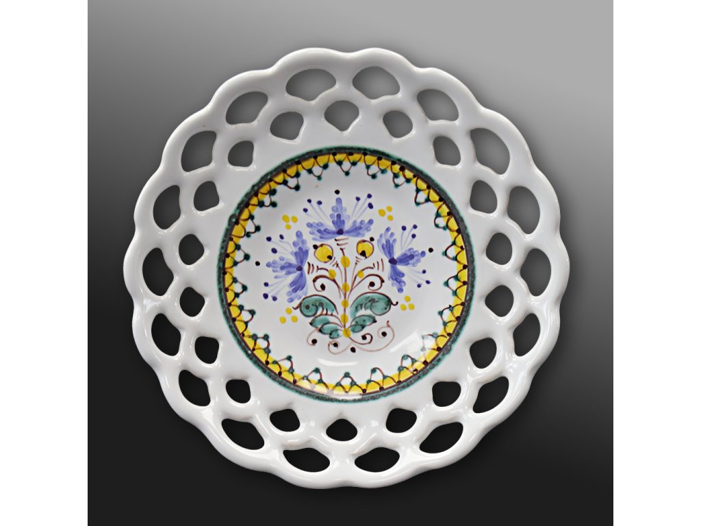 Malý krajkový talířek o průměru cca 10cm. S bílou glazurou a středovou rozetou dekorovanou ve žluté a zelené barvě s modrými doplňky.