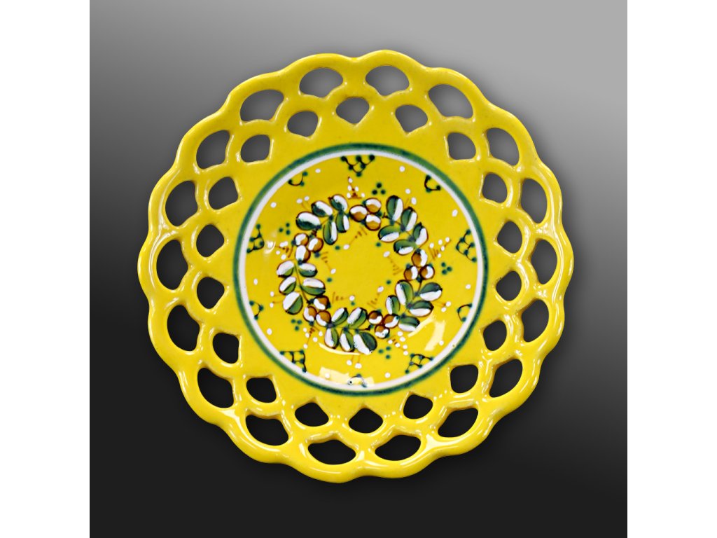 Malý krajkový talířek o průměru cca 10cm.  Se žlutou glazurou a  středovou rozetou dekorovanou v bílé a zelené barvě.