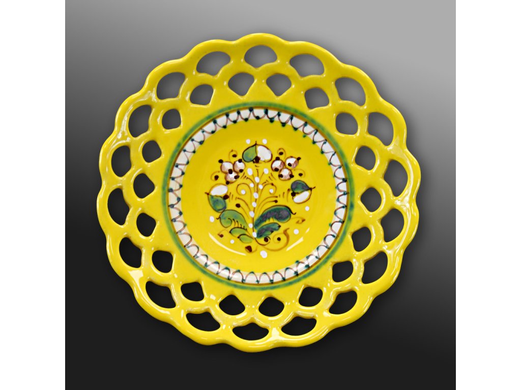 Malý krajkový talířek o průměru cca 10cm.  Se žlutou glazurou a  středovou rozetou dekorovanou v bílé a zelené barvě.