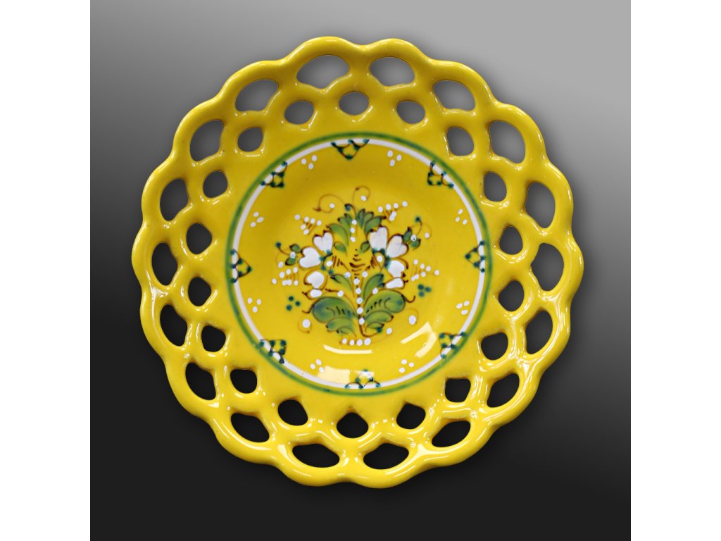 Malý krajkový talířek o průměru cca 10cm.  Se žlutou glazurou a  středovou rozetou dekorovanou v bílé a zelené barvě.
