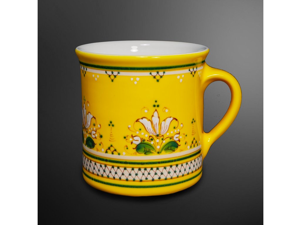 Žlutá glazura a zelenobílá dekorace.